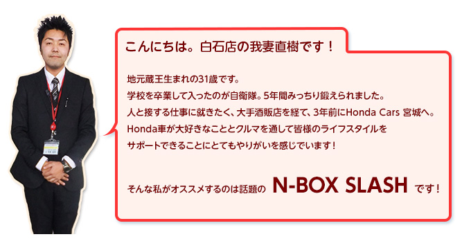 Honda Cars 宮城では全店でN-BOX SLASHの試乗車をご準備しておりますので、皆様のご来店を心よりお待ちしております。